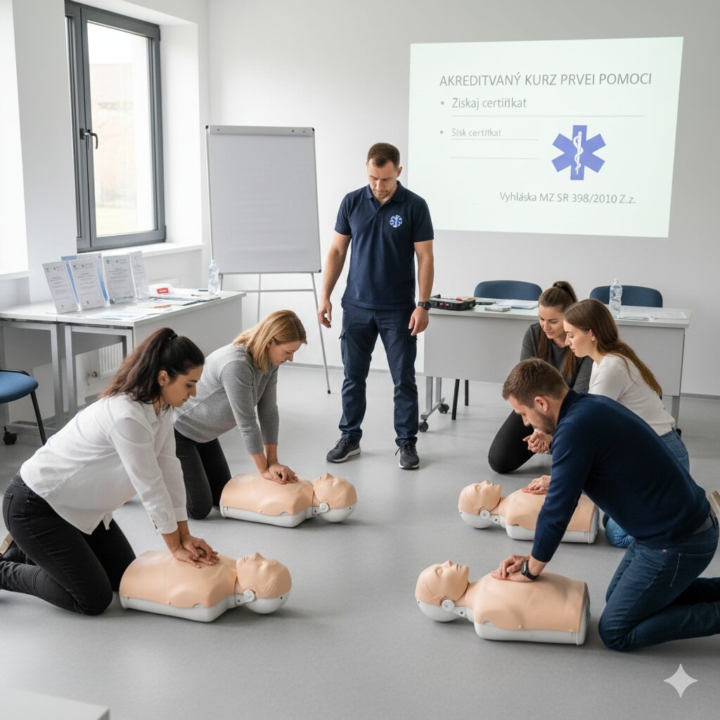 Ponúkame komplexné akreditované kurzy prvej pomoci, ktoré sú plne v súlade s Vyhláškou MZ SR 398/2010 Z.z. Naše školenia sú určené pre širokú škálu záujemcov: či už ste zamestnávateľ a potrebujete zaškoliť svojich zamestnancov, žiadateľ o vodičské oprávnenie plniaci zákonné požiadavky, alebo jednoducho jednotlivec či organizácia, ktorá si uvedomuje dôležitosť pripravenosti. Získajte oficiálne osvedčenie a predovšetkým – životne dôležité zručnosti.